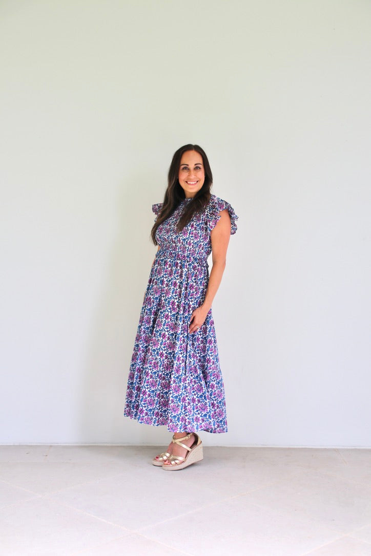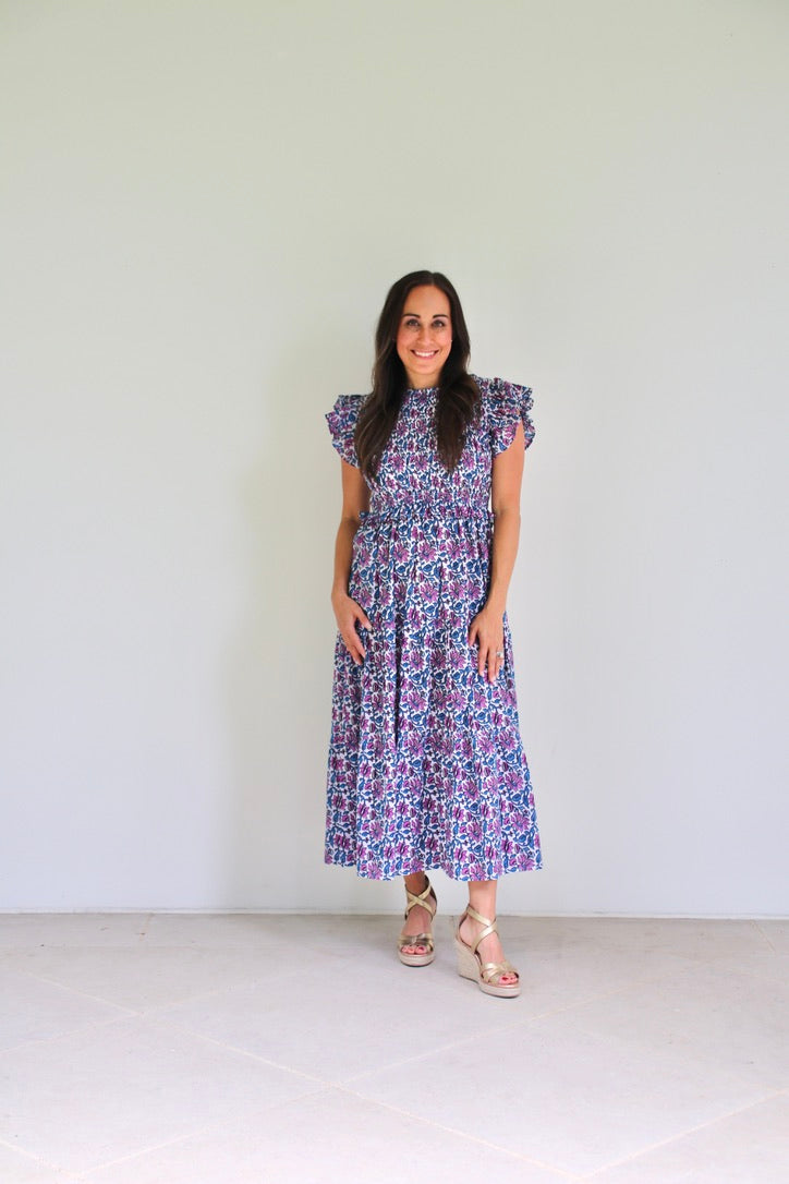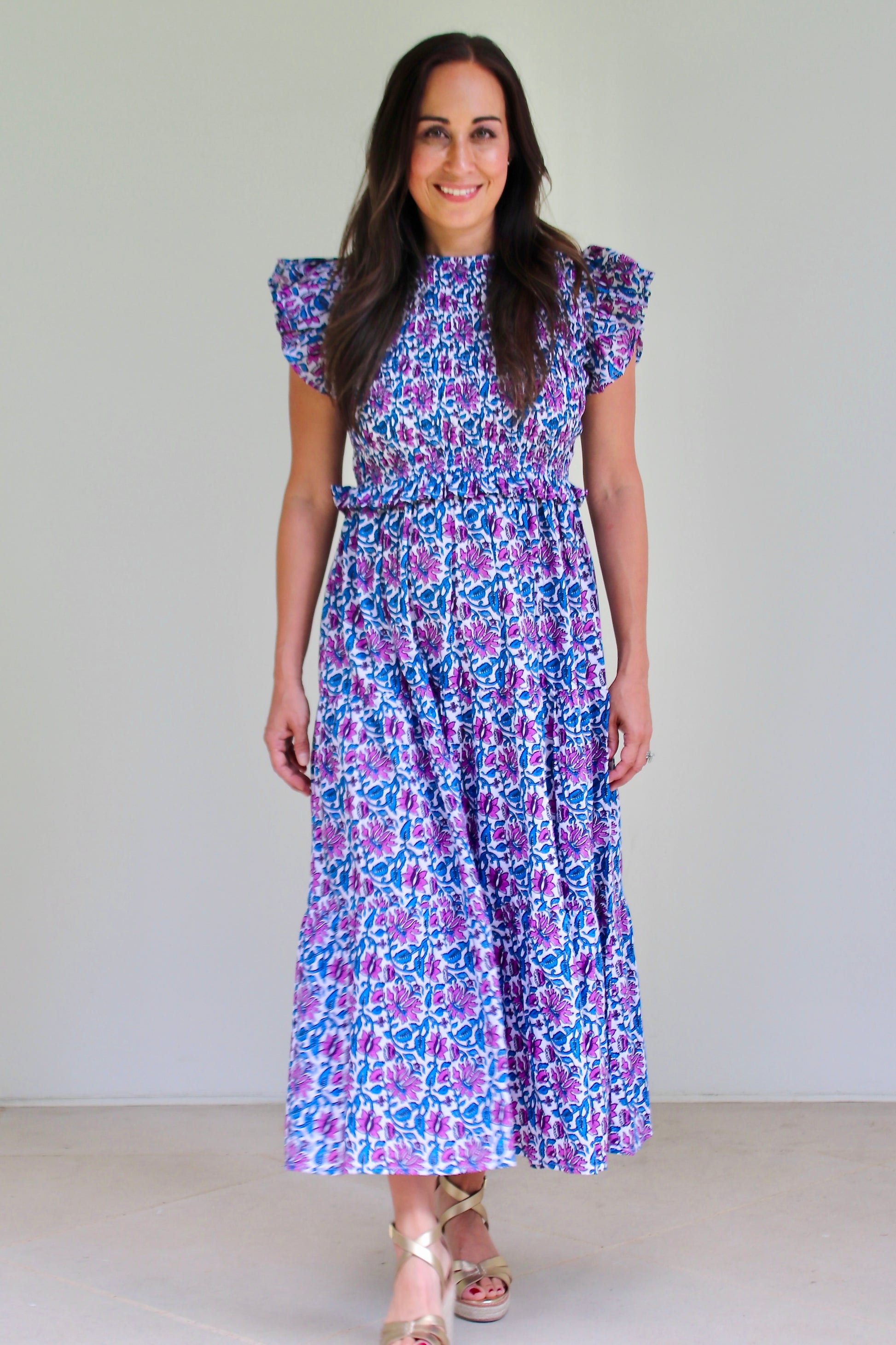 The Giulia smocked dress features a smocked bodice for a more form-fitting shape and flare tired maxi skirt. Delicate flutter sleeves adorn this timeless piece.