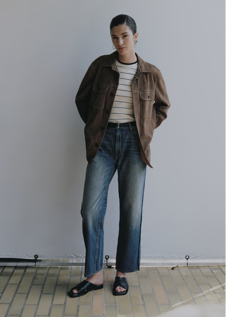 The sleek, dark wash and precise French outseams elevate the style with a refined and sophisticated touch.